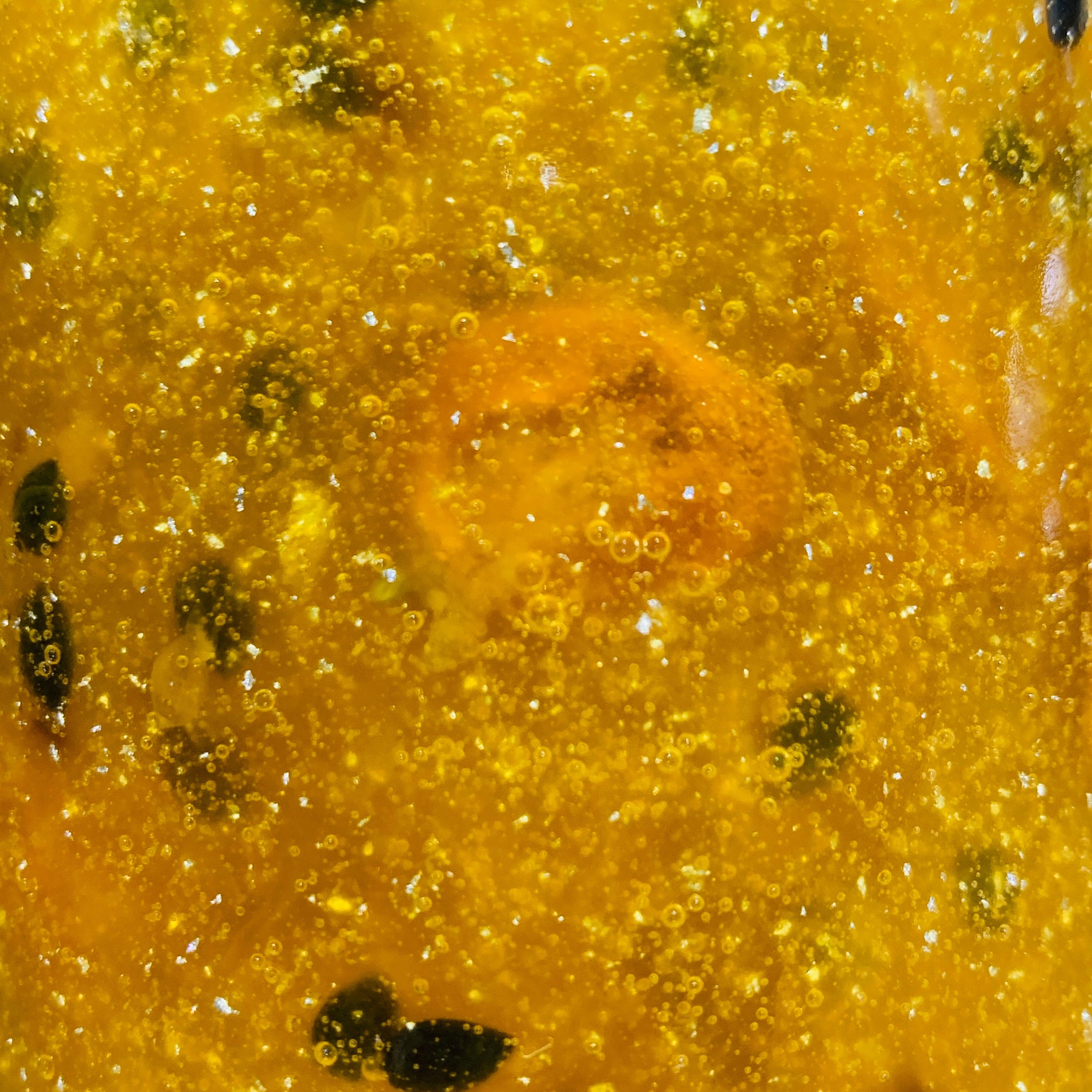 2: Passionfruit Pomelo 银喜百香果柚子绿茶 - Passionfruit pulp is infused with a citrus blend of pomelo, kumquats and green tea, fermented in raw wildflower honey, accented with edible silver leaf